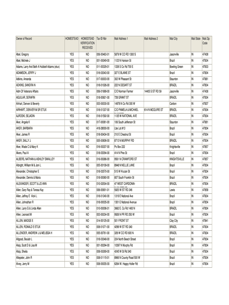 Owner of Record HOMESTEAD Tax ID NBR VERIFICATION RECEIVED Mail Address 1 Mail Address 2 Mail City Mail State Mail Zip Code Abel, Gregory YES NO 006-00463-01 5879 W CO RD 1300 S Jacksonville IN 47438