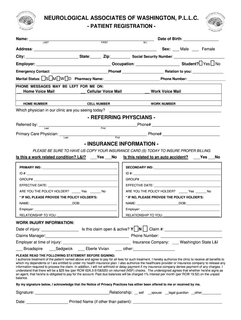The Patient Registration Form is a healthcare document used by Neurological Associates of Washington to collect essential personal, medical, and insurance information from new patients.