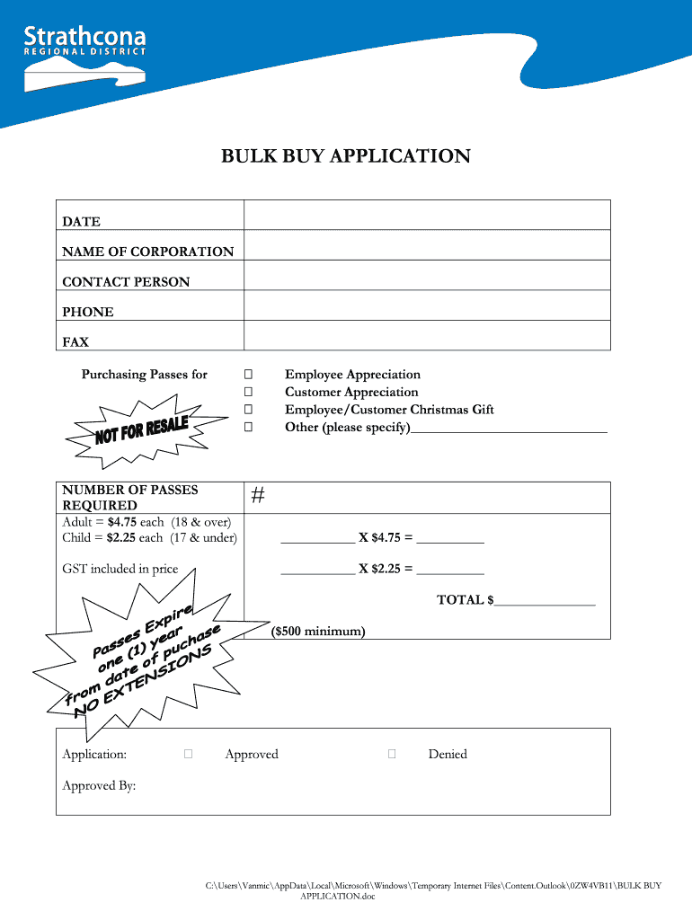 BULK BUY APPLICATION DATE NAME OF CORPORATION CONTACT PERSON PHONE FAX Purchasing Passes employee Appreciation Customer Appreciation Employee/Customer Christmas Gift Other (please specify) NUMBER