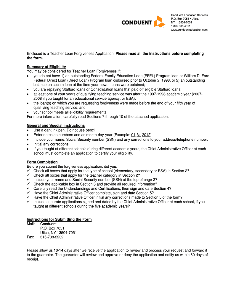 Conduct Education Services P.O. Box 7051 Utica, NY 135047051 1.800.835.4611 www.conduenteducation.comEnclosed is a Teacher Loan Forgiveness Application. Please read all the instructions before completing
