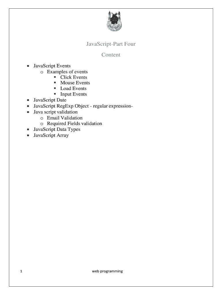 JavaScriptPart Four Content JavaScript Events o Examples of events Click Events Mouse Events Load Events Input Events JavaScript Date JavaScript Regexp Object regular expression JavaScript validation