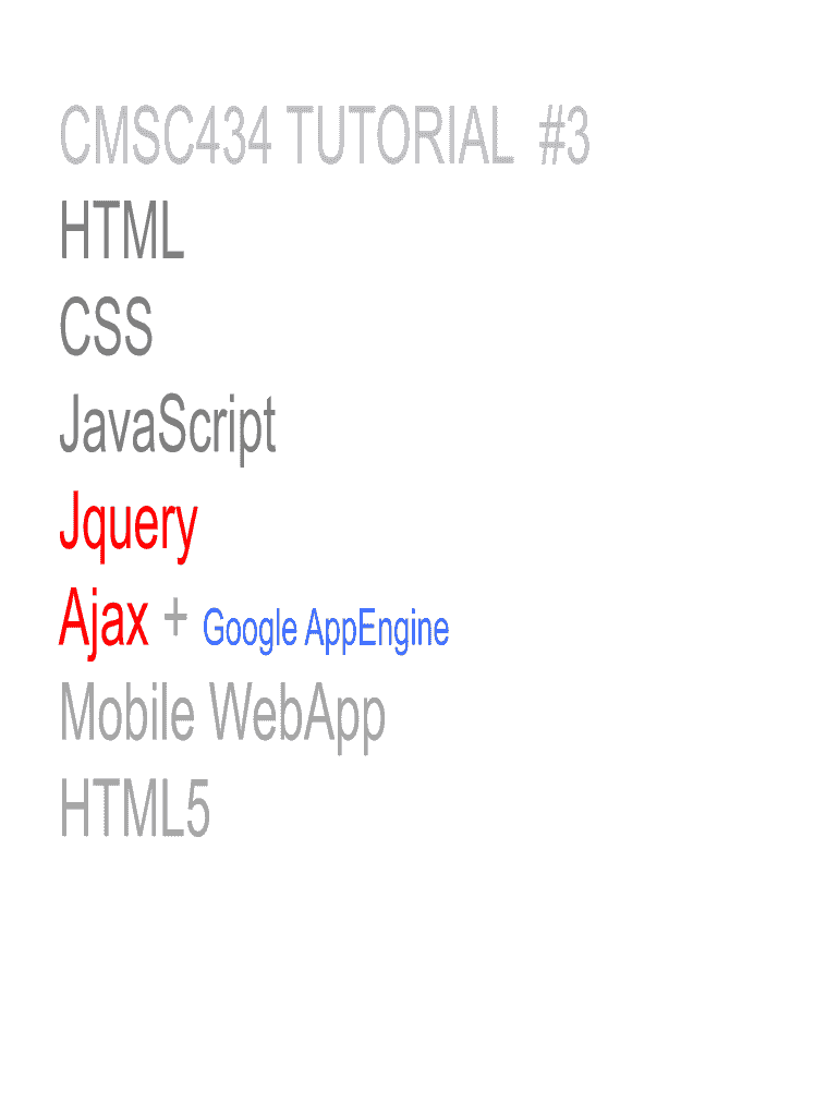 CMSC434 TUTORIAL #3 HTML CSS JavaScript jQuery Ajax + Google Appending Mobile WebP HTML5JQueryRecap JQuerysourcecodeisanexternalJavaScriptlescriptsrc “h;p://ajax.googleapis.com/ajax/libs/jquery/1.5/jquery.min.js