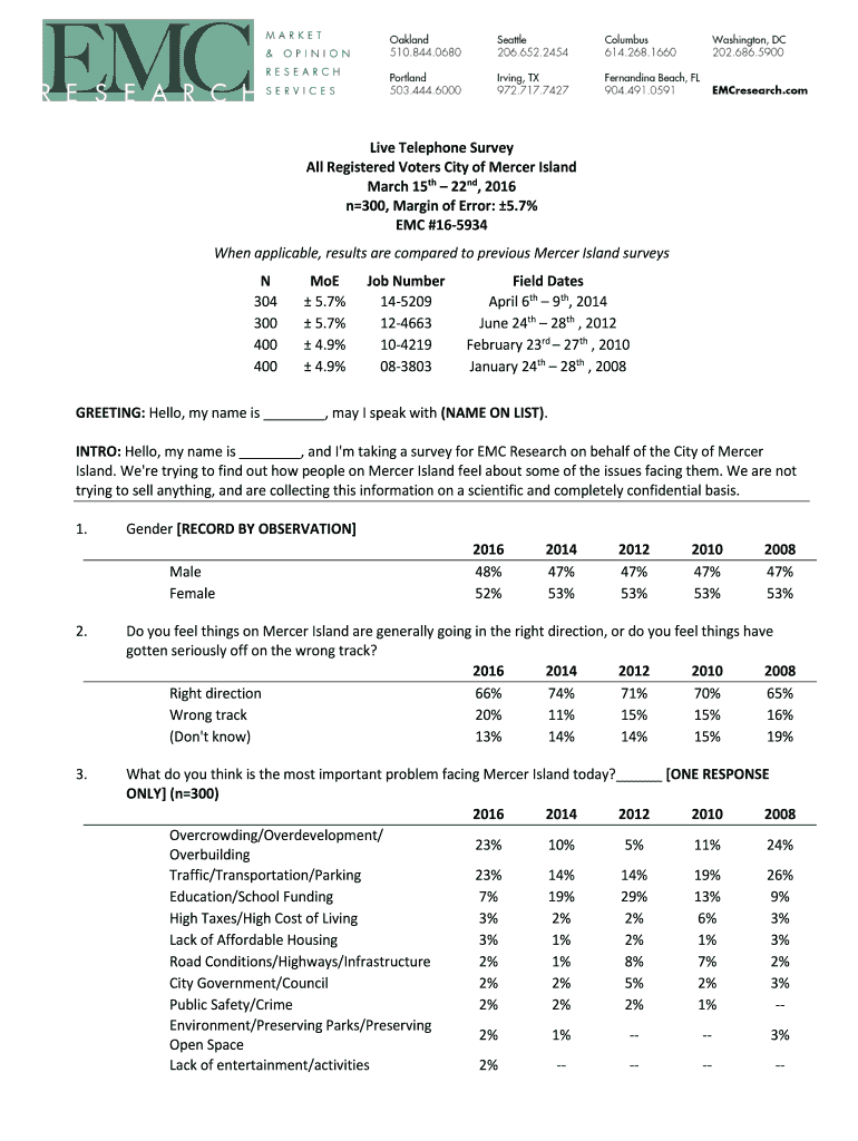 Live Telephone Survey All Registered Voters City of Mercer Island March 15th 22nd, 2016 n300, Margin of Error: 5.7% EMC #165934 When applicable, results are compared to previous Mercer Island surveys