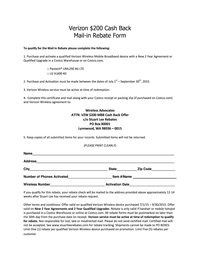Verizon $200 Cash Back Mailing Rebate Form To qualify for the Mail-in Rebate please complete the following: 1. Purchase and activate a qualified Verizon Wireless Mobile Broadband device with a New