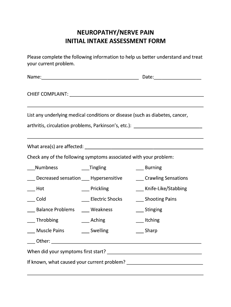 NEUROPATHY/NERVE PAIN INITIAL INTAKE ASSESSMENT FORM Please complete the following information to help us better understand and treat your current problem. Name: Date: CHIEF COMPLAINT: List any underlying