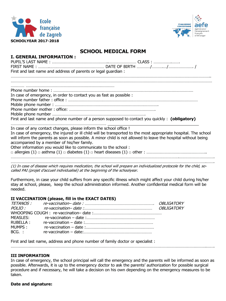 SCHOOLYARD 20172018I. GENERAL INFORMATION :SCHOOL MEDICAL FORMPUPILS LAST NAME :. CLASS :.