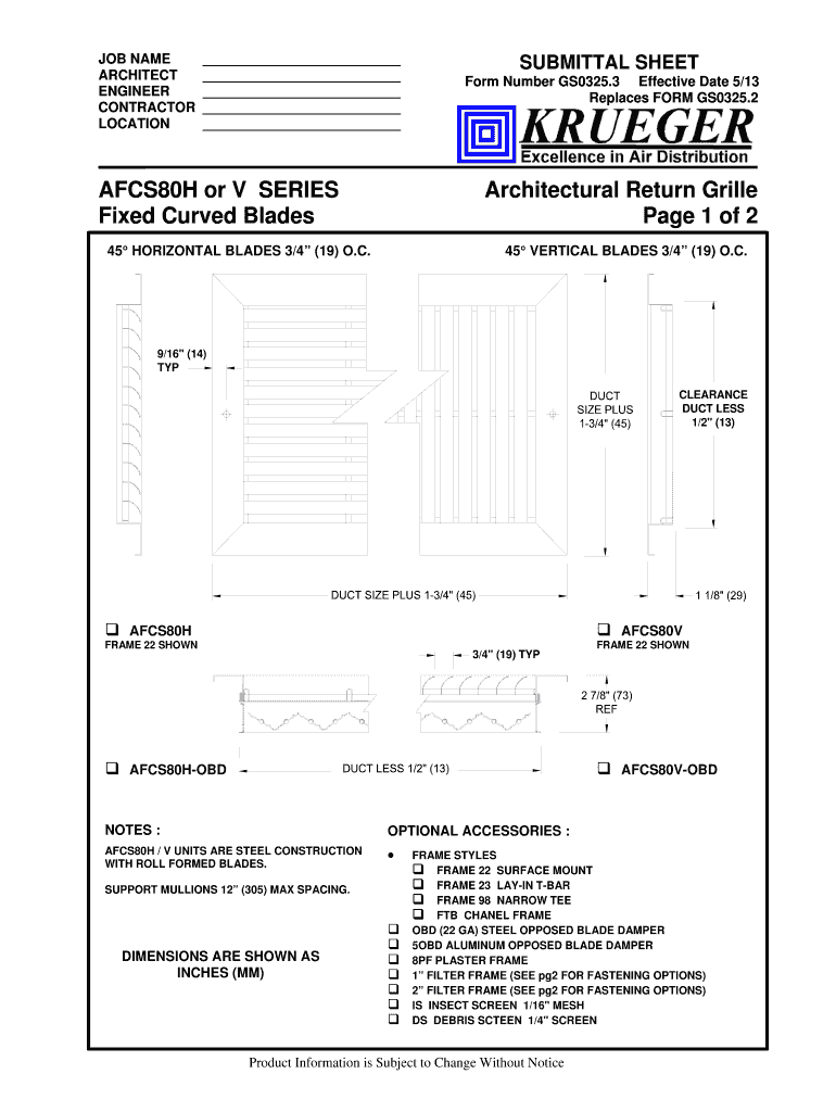 This submittal sheet includes several features that enhance its usability for project stakeholders. Among these features are blank fields specifically designed for user input, such as job name and location, which ensure that essential details are recorded. Additionally, the form contains checkboxes for selecting product options, such as AFCS80H and AFCS80V, allowing users to specify their exact requirements.