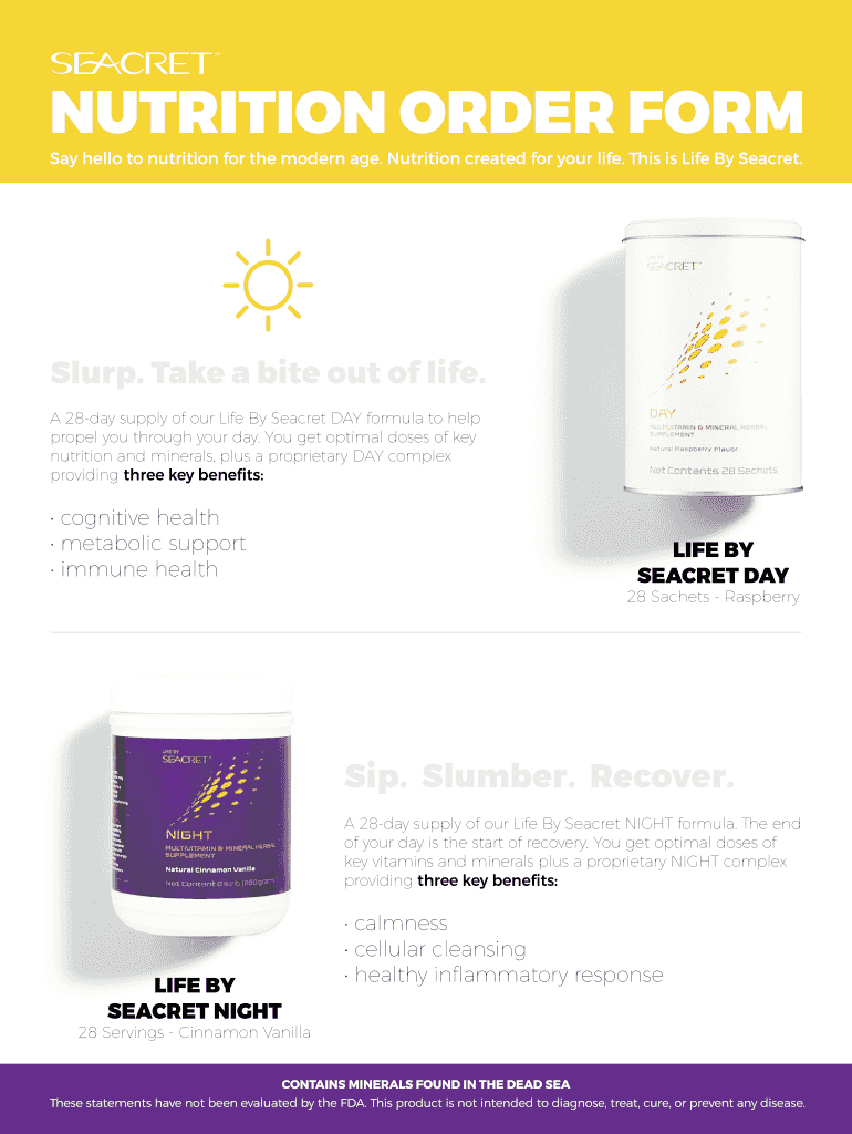 NUTRITION ORDER FORM Say hello to nutrition for the modern age. Nutrition created for your life. This is Life By Secret. Slurp. Take a bite out of life. A 28day supply of our Life By Secret DAY formula