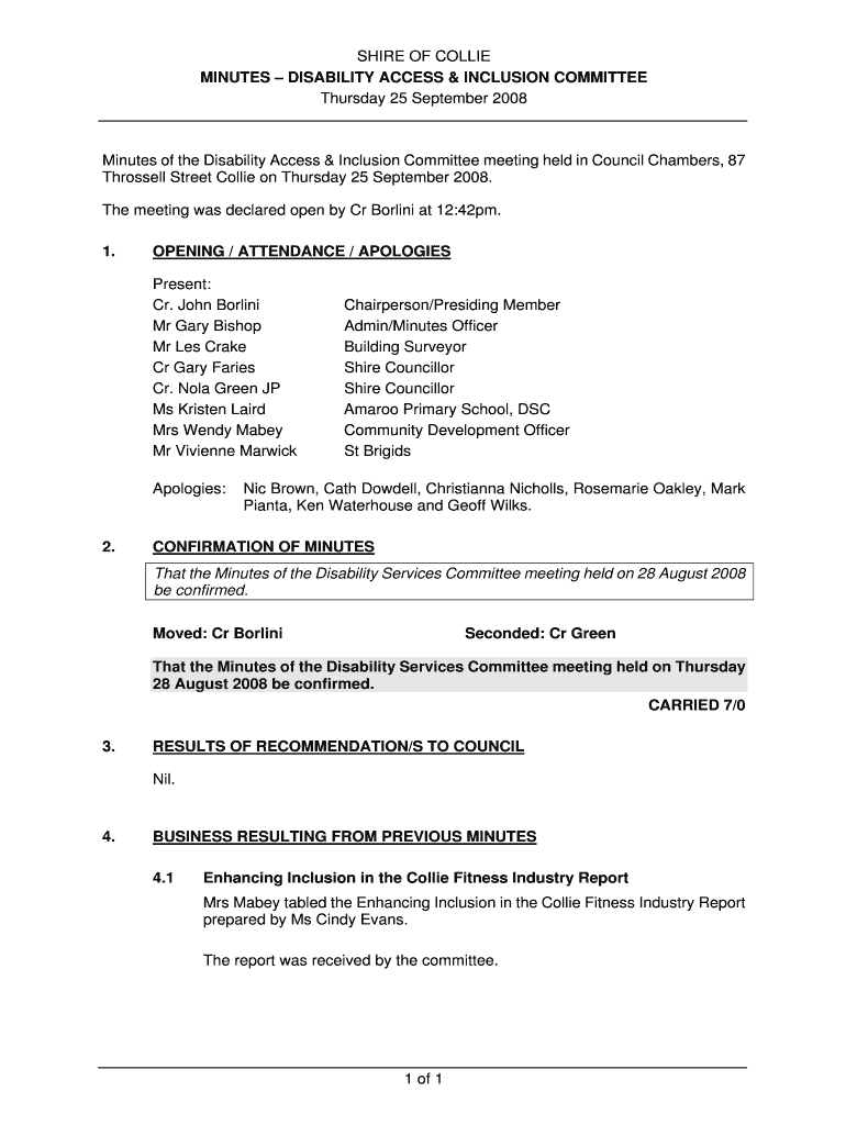 SHIRE OF COLLIE MINUTES DISABILITY ACCESS & INCLUSION COMMITTEE Thursday 25 September 2008 Minutes of the Disability Access & Inclusion Committee meeting held in Council Chambers, 87 Russell Street