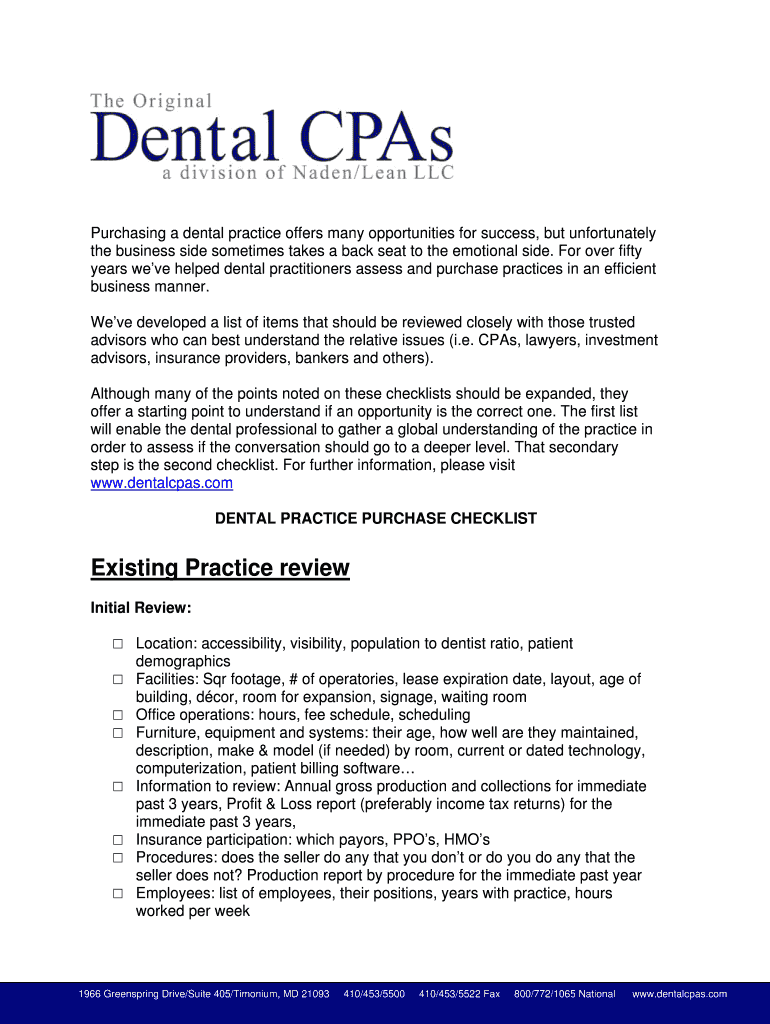 Get the free Dental Practice Purchase Checklist - Dental CPAs
