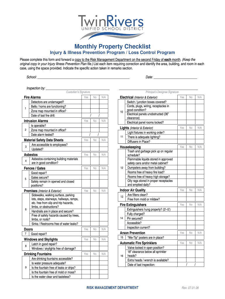 The Monthly Property Checklist is a vital form for schools, designed to ensure thorough inspections of various facilities and equipment. This checklist encompasses key elements such as fire alarms, safety equipment, and electrical systems, which are essential for maintaining a safe school environment. Regular inspections using this checklist are crucial, as they help uphold school safety standards and compliance with legal requirements.