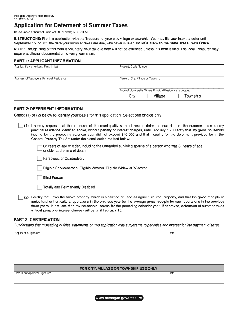 The Michigan Summer Tax Deferment Application is a tax exemption certificate used by Michigan residents to request a deferment of summer property taxes until February 15.