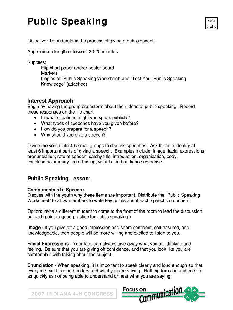 Public Speaking Objective: To understand the process of giving a public speech. Approximate length of lesson: 2025 minutes Supplies: Flip chart paper and/or poster board Markers Copies of Public Speaking