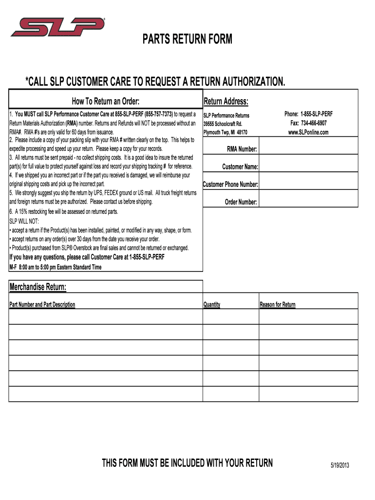Any customer who has purchased parts from SLP Performance and has an RMA number from SLP Customer Care can use this return form.
