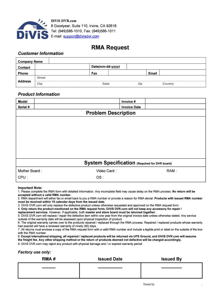 The DiViS DVR RMA Request Form is a business document used by customers to request a return merchandise authorization for defective products.