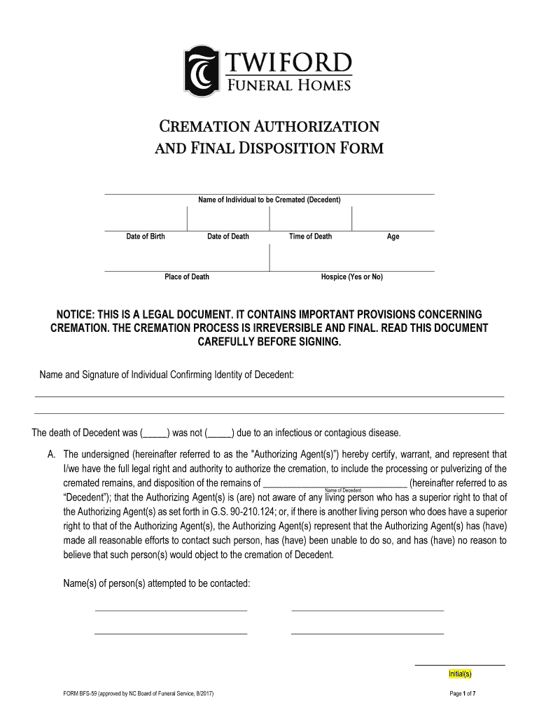 Cremation Authorization and Final Disposition Form Name of Individual to be Cremated (Decedent)Date of BirthDate of Deathlike of Birthplace of DeathAgeHospice (Yes or No)NOTICE: THIS IS A LEGAL DOCUMENT.