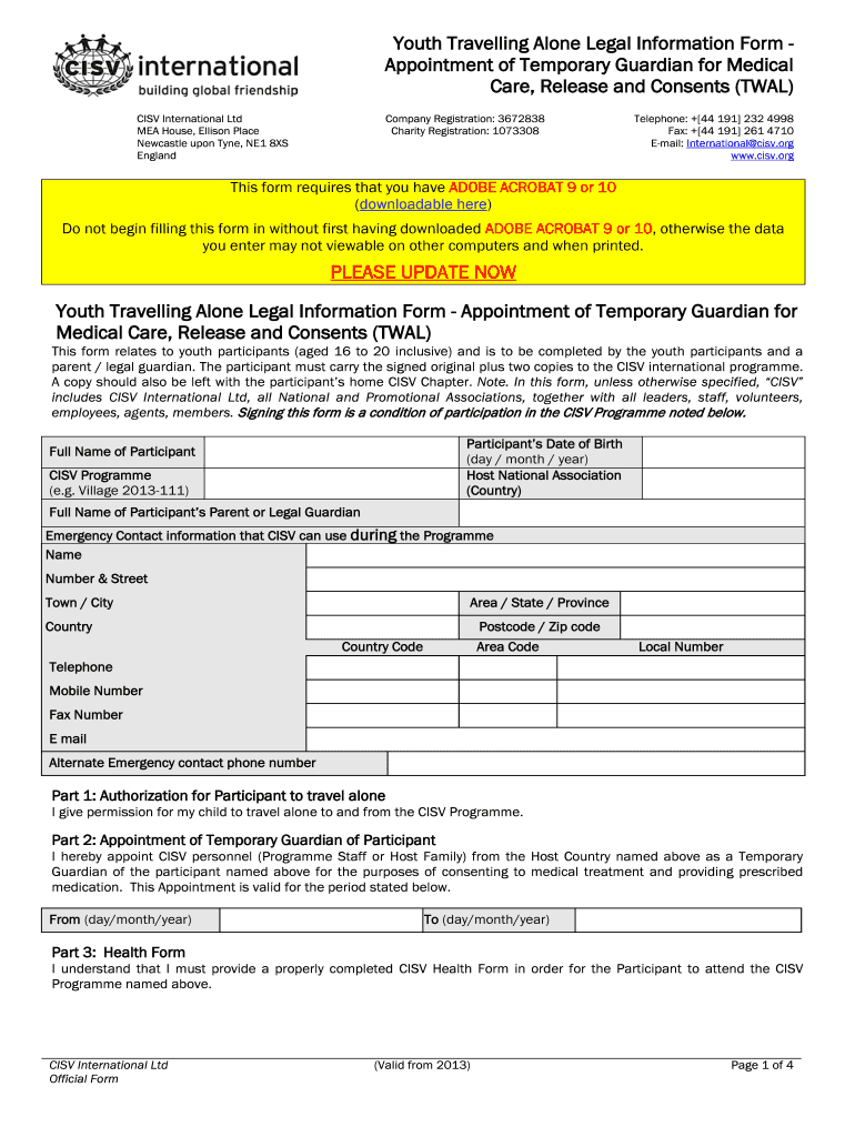 Get the free Youth Travelling Alone Legal Information Form - Appointment of ... - cisv