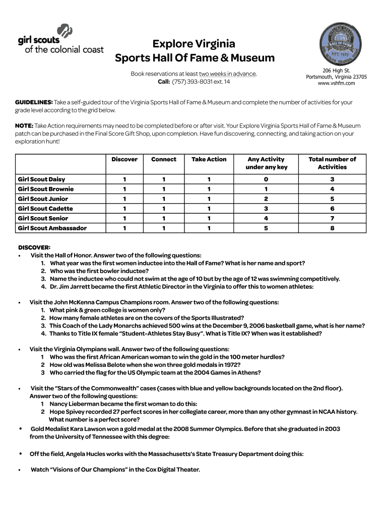 The primary goal of the Virginia Sports Hall of Fame Museum Activity Guide is to create educational and rewarding outcomes for scouts during their visit. By successfully completing the activities in the guide, scouts have the opportunity to earn a Virginia Sports Hall Of Fame patch. Engaging in the sports hall of fame activities fosters a deeper connection to the content and promotes teamwork and exploration among scouts.