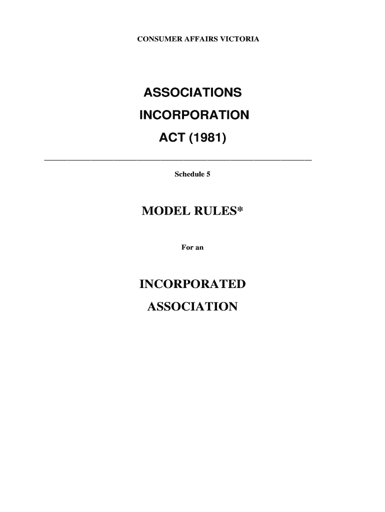 CONSUMER AFFAIRS VICTORIAASSOCIATIONS INCORPORATION ACT (1981) Schedule 5MODEL RULES* For unincorporated ASSOCIATIONINCLUSIVE OF 1ST July 1998 AMENDMENTS SCHEDULE: 5 MODEL RULES* FOR AN INCORPORATED