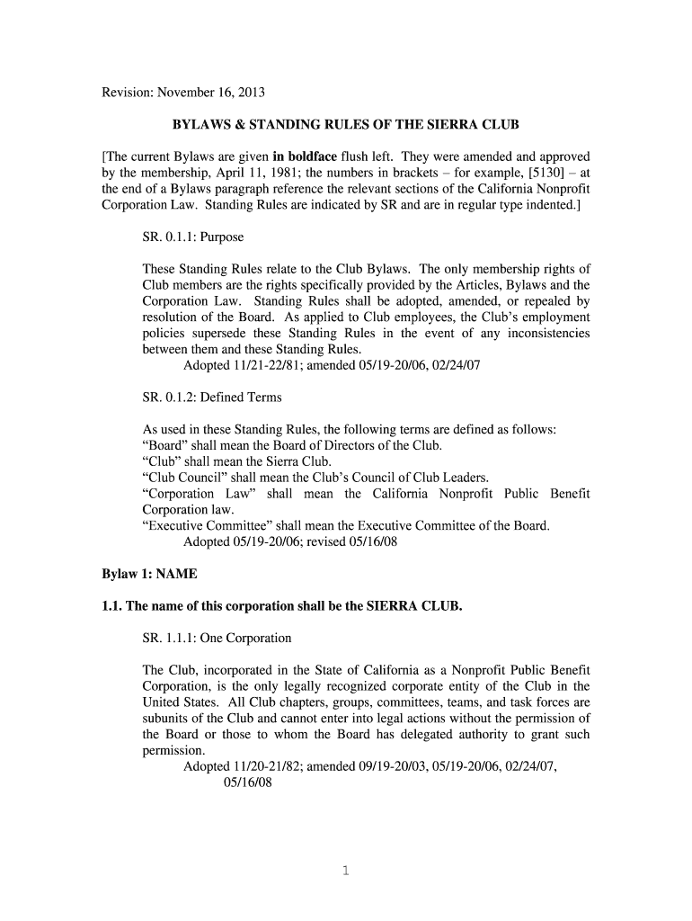 Revision: November 16, 2013, BYLAWS & STANDING RULES OF THE SIERRA CLUB The current Bylaws are given in boldface flush left. They were amended and approved by the membership, April 11, 1981; the numbers