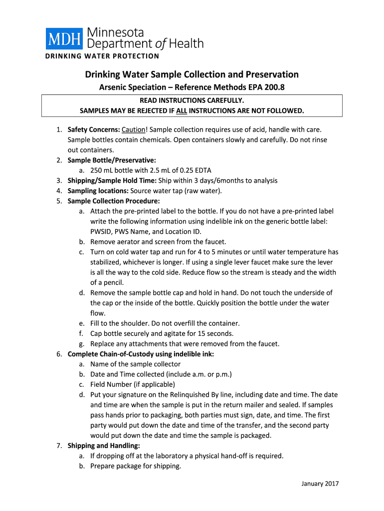 DRINKING WATER PROTECTIONDrinking Water Sample Collection and Preservation Arsenic Speciation Reference Methods EPA 200.8READ INSTRUCTIONS CAREFULLY. SAMPLES MAY BE REJECTED IF ALL INSTRUCTIONS ARE