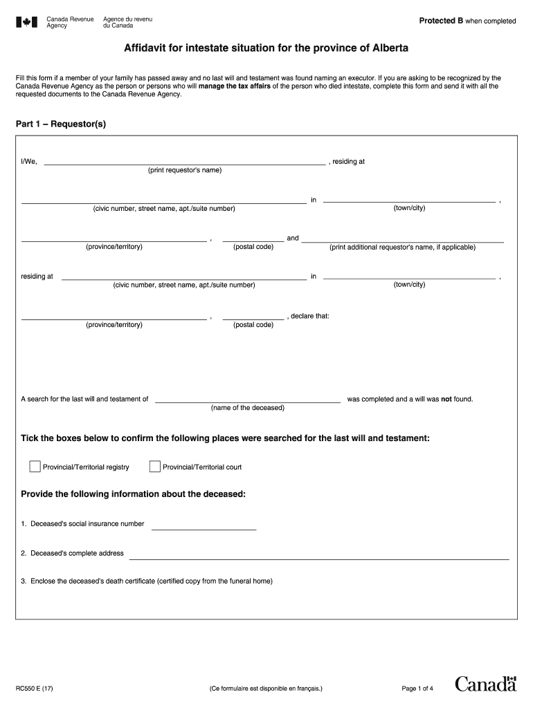 Protected B when completedAffidavit for intestate situation for the province of Alberta Fill this form if a member of your family has passed away and no last will and testament was found naming an