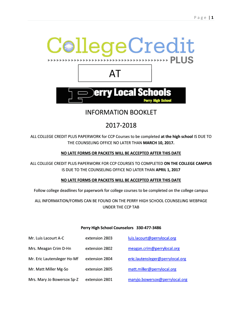 Page 1ATINFORMATION BOOKLET 20172018 ALL COLLEGE CREDIT PLUS PAPERWORK for CCP Courses to be completed at the high school IS DUE TO THE COUNSELING OFFICE NO LATER THAN MARCH 10, 2017. NO LATE FORMS