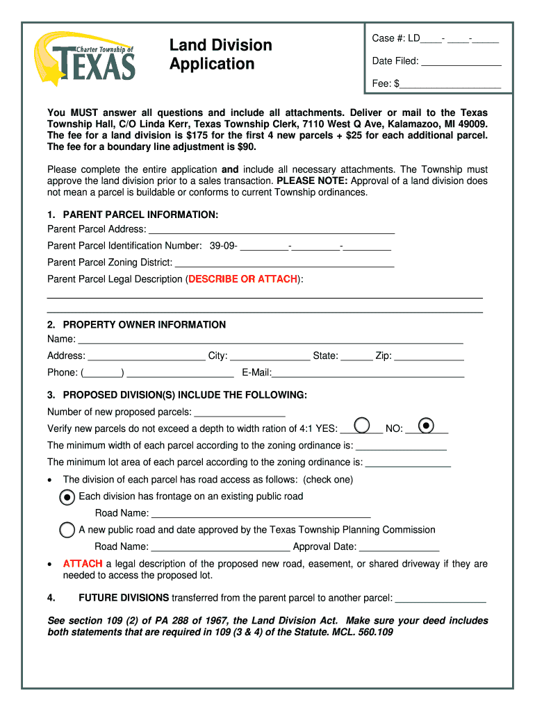 Land Division Application Case #: LD Date Filed: Fee: $ You MUST answer all questions and include all attachments. Deliver or mail to the Texas Township Hall, C/O Linda Kerr, Texas Township Clerk,