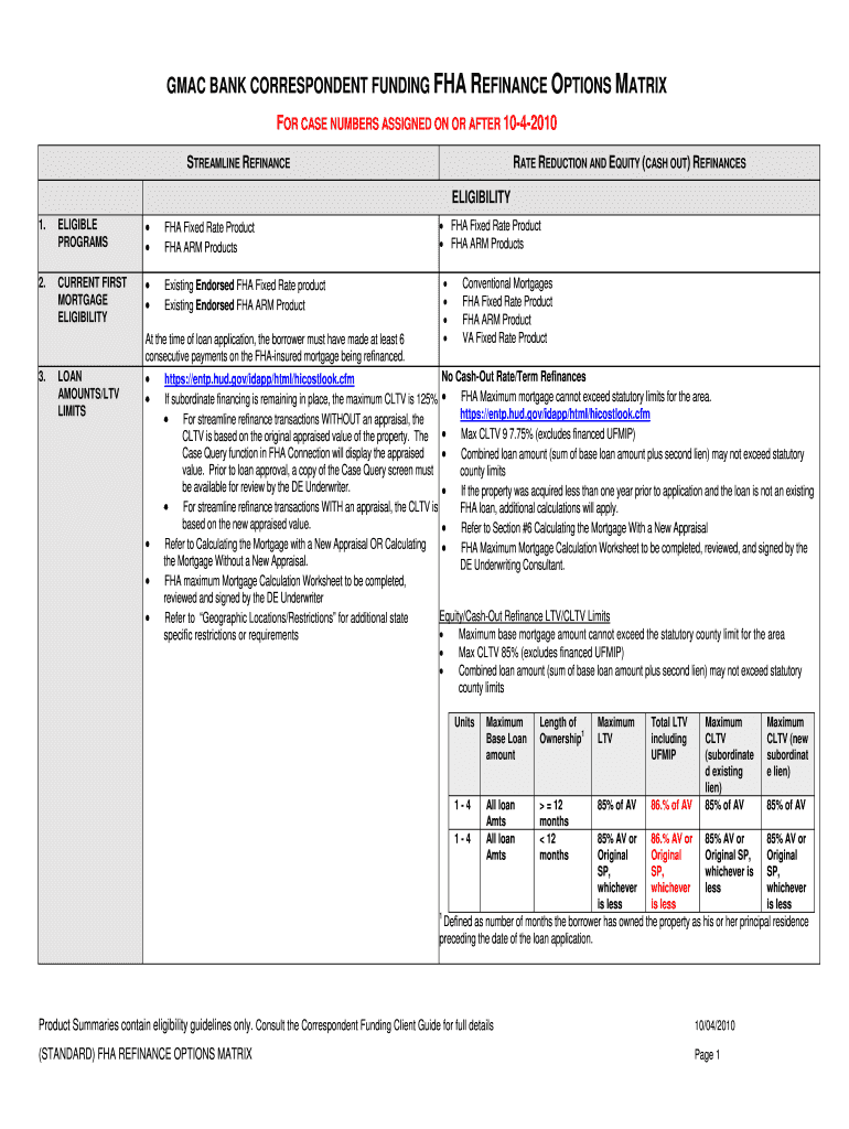 GMAC BANK CORRESPONDENT FUNDING FHA REFINANCE OPTIONS MATRIX FOR CASE NUMBERS ASSIGNED ON OR AFTER 1042010 STREAMLINE REFINANCERATE REDUCTION AND EQUITY (CASH OUT) REFINANCES ELIGIBILITY1.ELIGIBLE