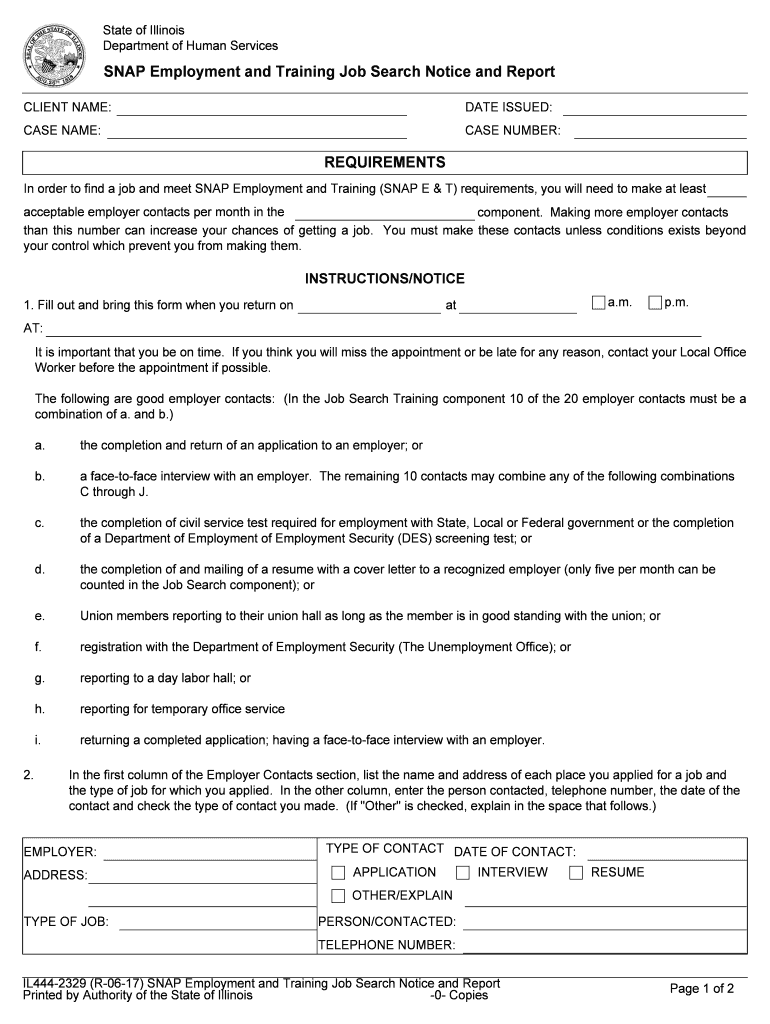 State of Illinois Department of Human ServicesSNAP Employment and Training Job Search Notice and Report CLIENT NAME:DATE ISSUED:CASE NAME:CASE NUMBER:REQUIREMENTS In order to find a job and meet SNAP