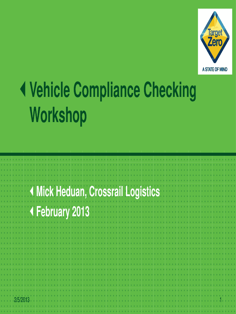 Vehicle Compliance Checking Workshop Mick Median, Cross rail Logistics February 20132/5/20131Workshop Agenda Workshop objectives and benefits Background why vehicle safety kit? Safety kit requirements