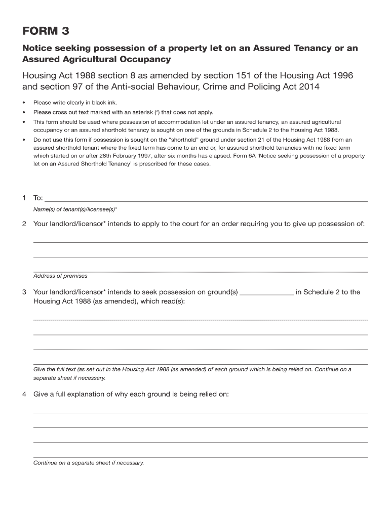 FORM 3 Notice seeking possession of a property let on an Assured Tenancy or an Assured Agricultural Occupancy Housing Act 1988, section 8 as amended by section 151 of the Housing Act 1996 and section