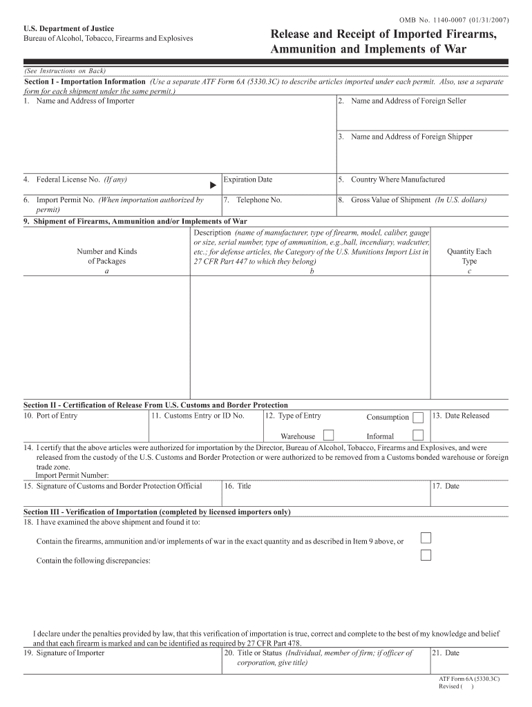 OMB No. 11400007 (01/31/2007)U.S. Department of Justice Bureau of Alcohol, Tobacco, Firearms and ExplosivesRelease and Receipt of Imported Firearms, Ammunition and Implements of War(See Instructions