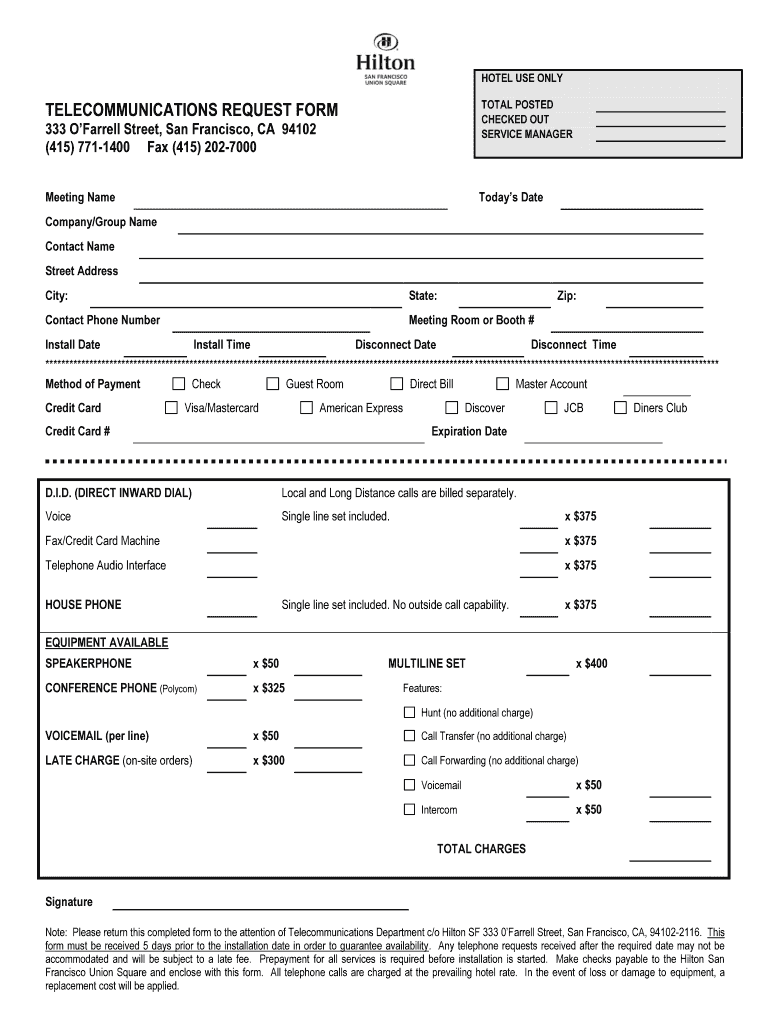 HOTEL USE ONLYTELECOMMUNICATIONS REQUEST FORMAL POSTED