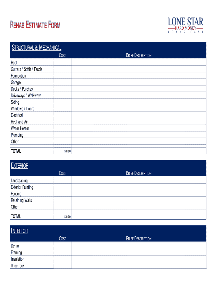 REHAB ESTIMATE FORM STRUCTURAL & MECHANICAL Roof Gutters / Soffit / Fascia Foundation Garage Decks / Porches Driveways / Walkways Siding Windows / Doors Electrical Heat and Air Water Heater Plumbing
