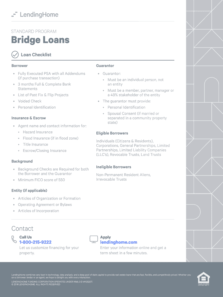 STANDARD PROGRAMBridge Loans Loan Checklist Borrower Fully Executed PSA with all Addendums (if purchase transaction) 3 months Full & Complete Bank Statements List of Past Fix & Flip Projects Voided