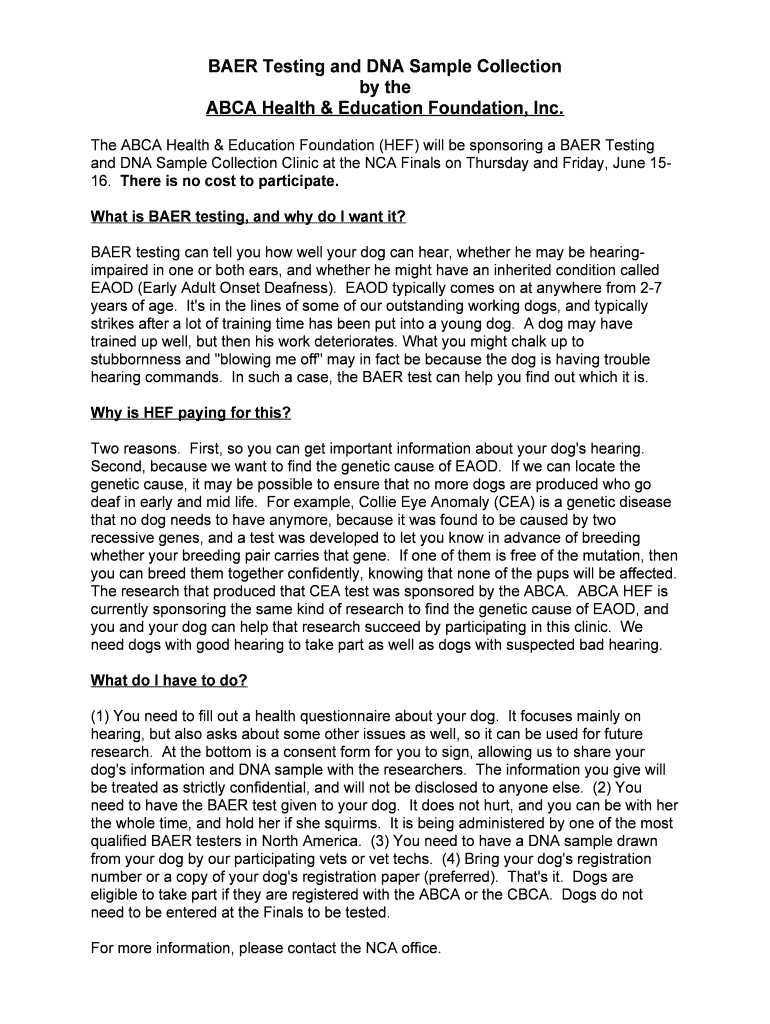 BAR Testing and DNA Sample Collection by the ABCs Health & Education Foundation, Inc. The ABCs Health & Education Foundation (HEF) will be sponsoring a BAR Testing and DNA Sample Collection Clinic