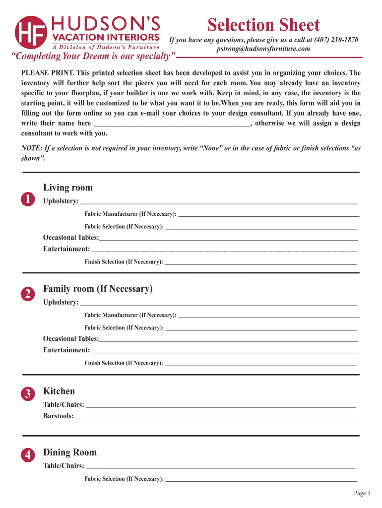 A D i v i s i o n o f H u d s o n s F u r n i t u r eSelection Sheet