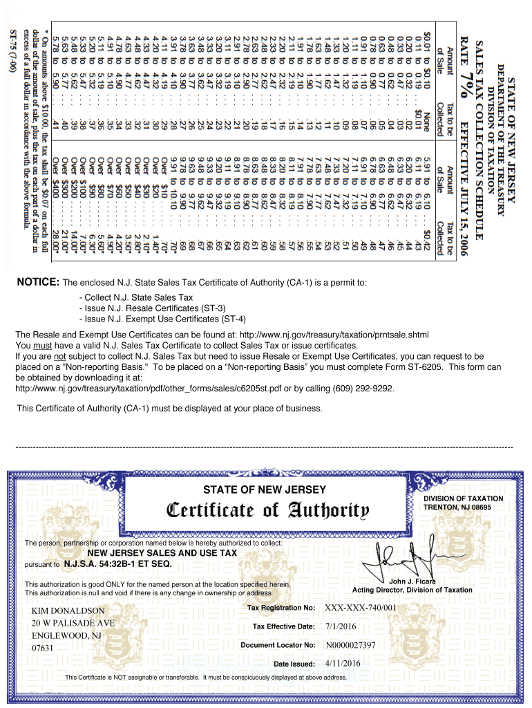 NOTICE: The enclosed N.J. State Sales Tax Certificate of Authority (CA1) is a permit to: Collect N.J. State Sales Tax Issue N.J. Resale Certificates (ST3) Issue N.J. Exempt Use Certificates (ST4)The