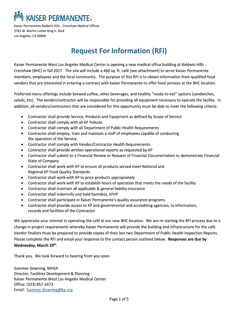 Kaiser Permanent Baldwin Hills Crenshaw Medical Offices 3782 W. Martin Luther King Jr. Blvd Los Angeles, CA 90008Request For Information (RFI) Kaiser Permanent West Los Angeles Medical Center is opening