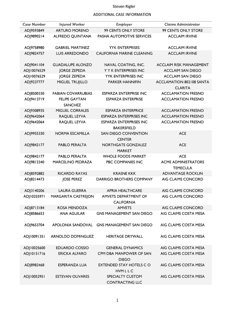 Case NumberInjured WorkerEmployerClaims AdministratorADJ9593849