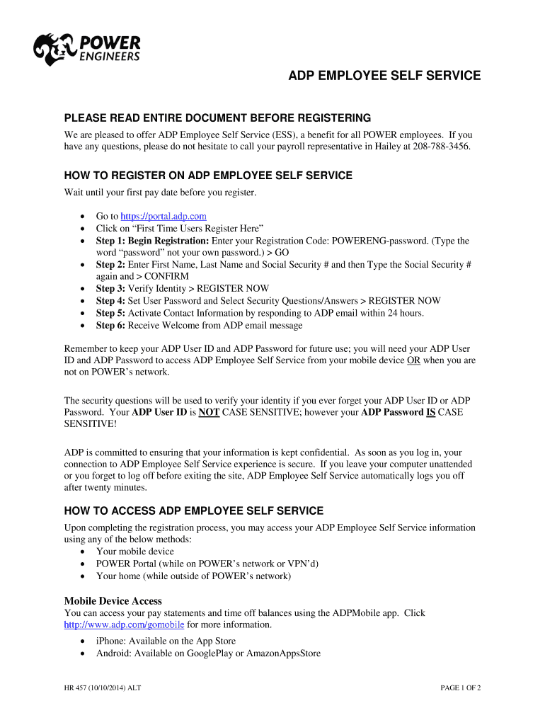 ADP EMPLOYEE SELF SERVICE PLEASE READ ENTIRE DOCUMENT BEFORE REGISTERING We are pleased to offer ADP Employee Self Service (ESS), a benefit for all POWER employees. If you have any questions, please