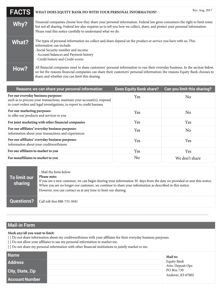 FACTS Rev. Aug. 2017WHAT DOES EQUITY BANK DO WITH YOUR PERSONAL INFORMATION? Why? Financial companies choose how they share your personal information. Federal law gives consumers the right to limit