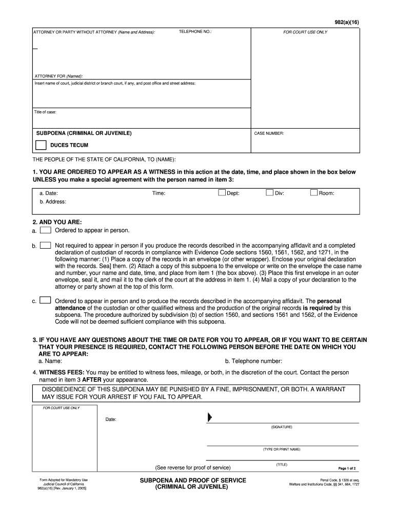 Get the free California Subpoena Duces Tecum