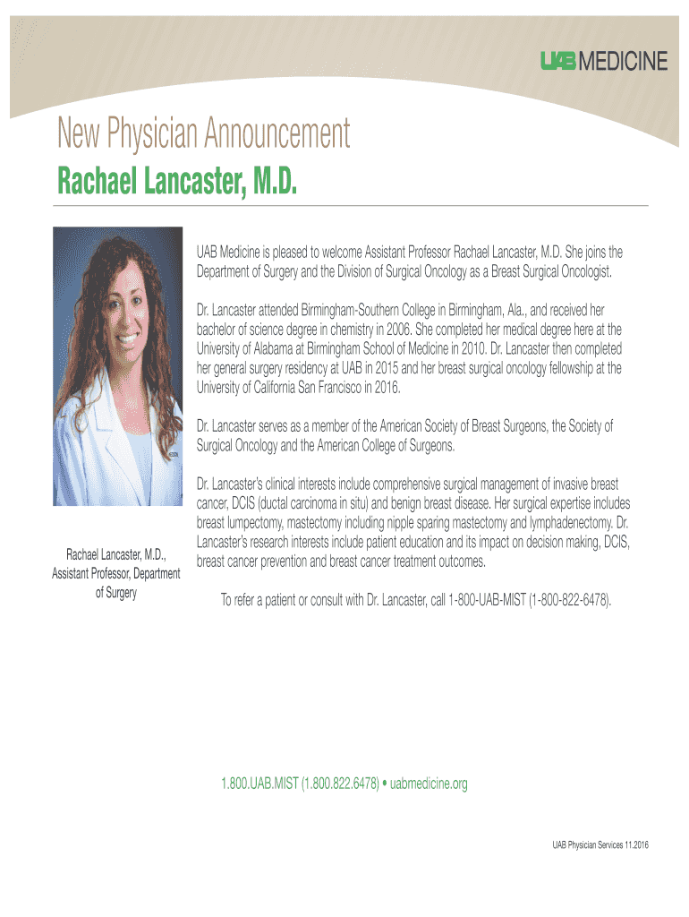 Rachael Lancaster, M.D.UAB Medicine is pleased to welcome Assistant Professor Rachael Lancaster, M.D. She joins the