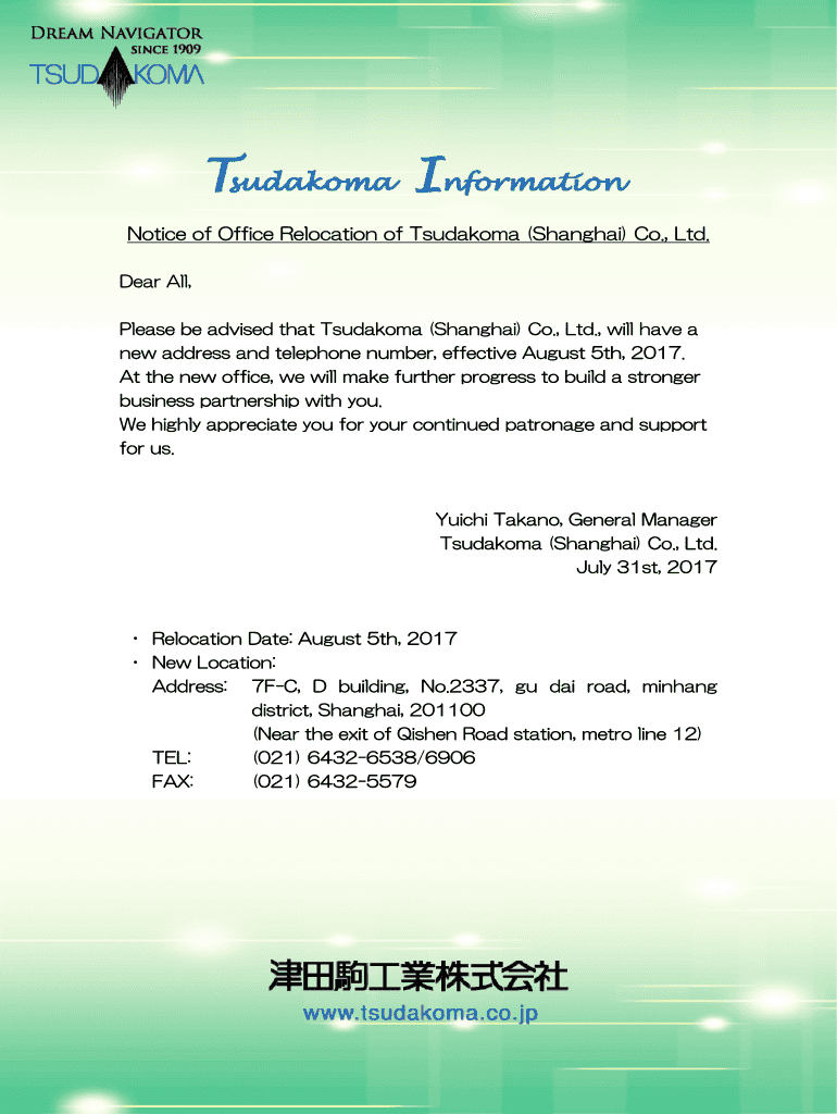 Get the free Notice of Office Relocation of Tsudakoma (Shanghai) Co