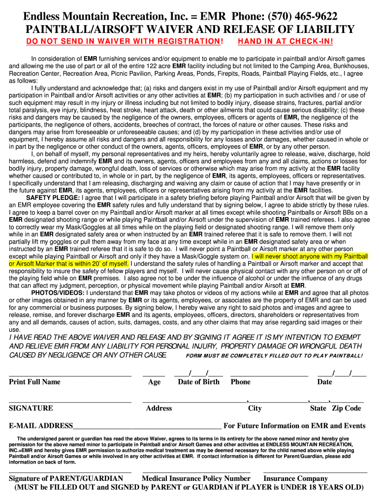 Endless Mountain Recreation, Inc. EMR Phone: (570) 4659622 PAINTBALL/AIRSOFT WAIVER AND RELEASE OF LIABILITY DO NOT SEND IN WAIVER WITH REGISTRATION!HAND IN AT CHECKING! In consideration of EMR furnishing