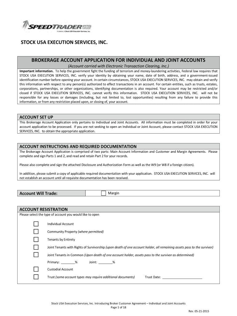 BROKERAGE ACCOUNT APPLICATION FOR INDIVIDUAL AND JOINT ACCOUNTS