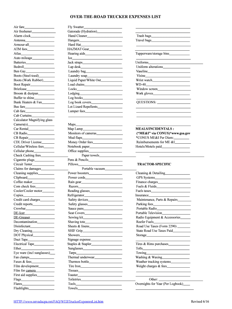 OVERHEAD TRUCKER EXPENSES LIST Air fare Air freshener Alarm clock Antenna Armour all ATM fees Atlas Auto mileage Batteries Bedroll Ben Gay Boots (Steel toed) Boots (Work Rubber) Boot Repair Briefcase