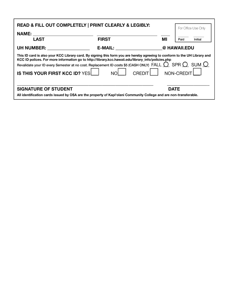 The KCC Student ID Card Application is a school enrollment form used by students at Kapi‘olani Community College to obtain their student ID card, which is also utilized as a library card.